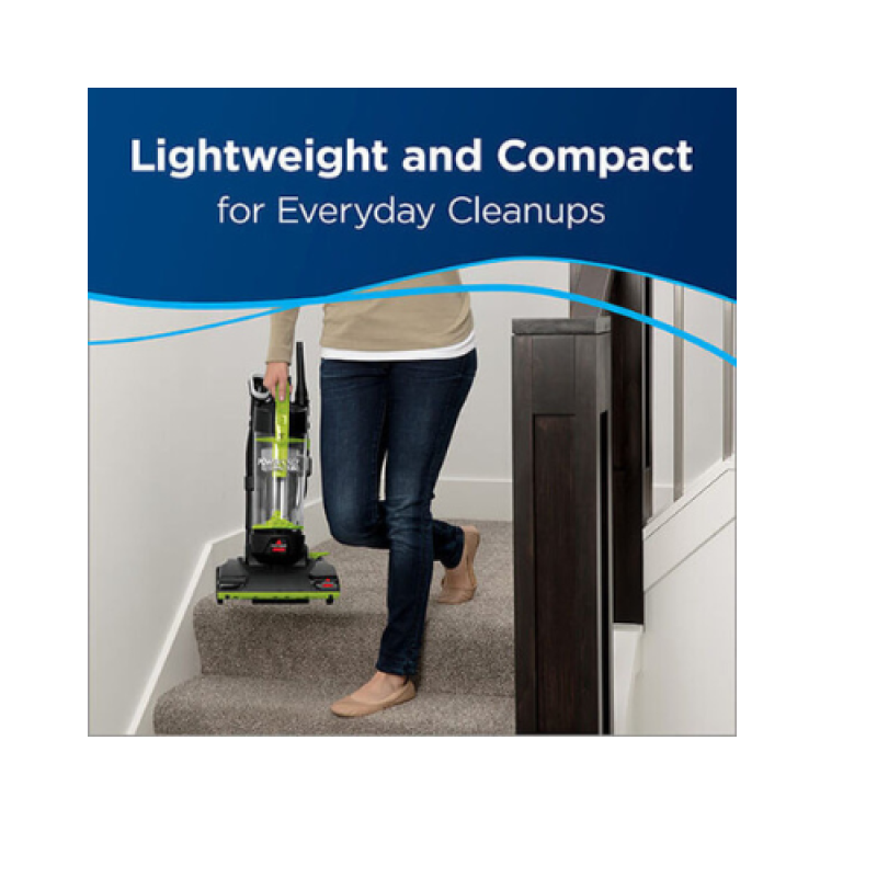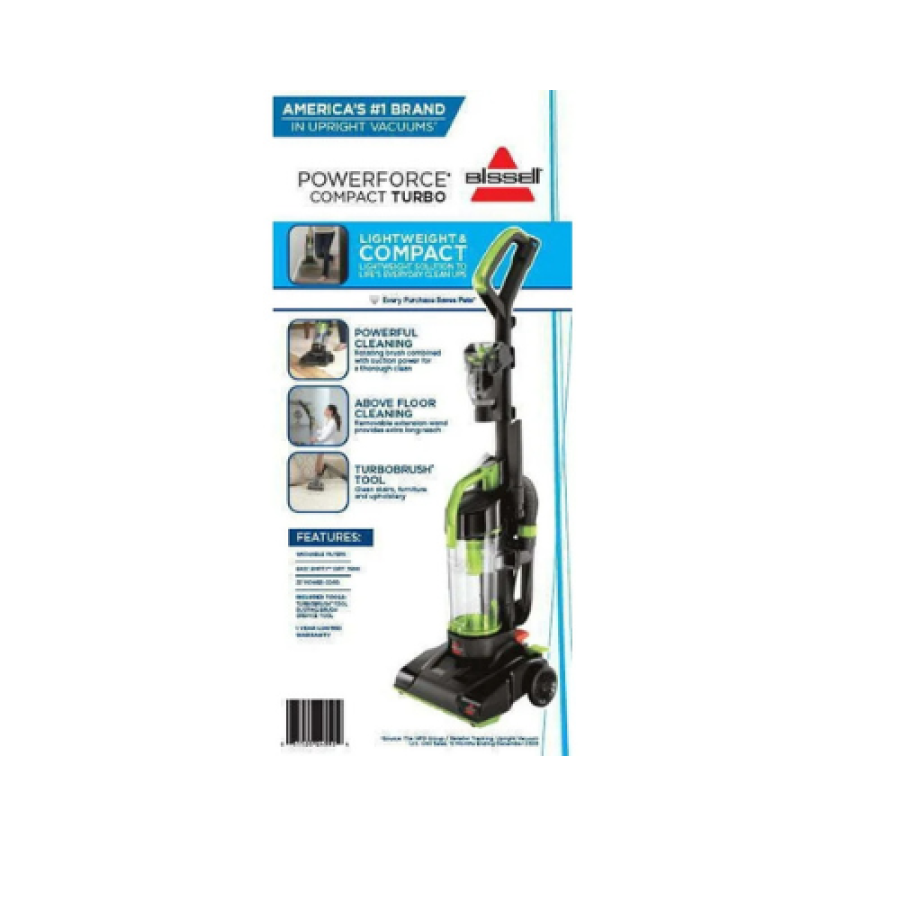 The BISSELL Power Force Compact Turbo Bagless Vacuum 2690 has a product weight of 7.5 lbs and measures approximately 11.5" L x 10" W x 25.5" H. It has a 10-inch cleaning path width and a 23-foot power cord.