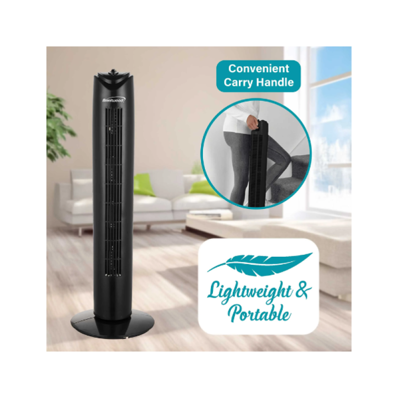 Use the 45 watt Brentwood F-32TBK 3-Speed 30-Inch Oscillating Tower Fan to produce intense cooling. Use this fan to create full room circulation saving you energy and money. Choose between 3 comfortable cooling speeds and enjoy a wide blade of cool air. Moves air up to 425 feet and has a maximum CFM of 1,928 with 68° wide oscillation. Easily relocate the fan from room to room using the built-in carry handle. Conveniently wrap the cord up for storage. Non-slip rubber feet keep the fan securely in place. Our jet black tower fan adds a modern aesthetic to any home or work space.