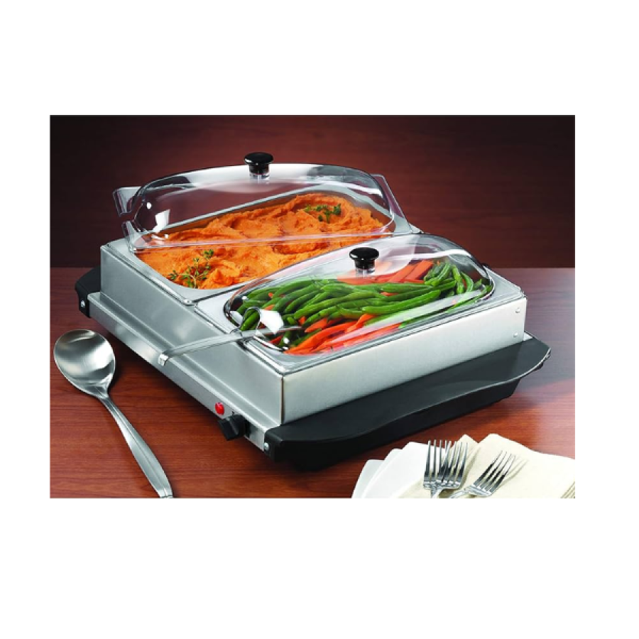 The 200w Brentwood BF-215 3-Quart 2 Pan Buffet Server and Warming Tray includes two heat resistant, BPA Free, clear domed lids. Seconds as a 10” by 12” warming tray for finger foods. Made from stainless steel for durability. Features adjustable heat, cool touch handles, and power indicator light. Beautifully brushed stainless steel finish complement by any settings