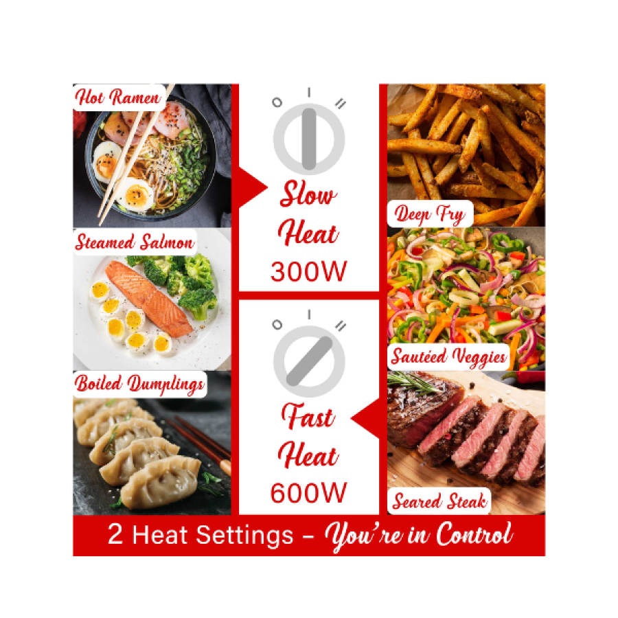 Use the 600w Brentwood HP-3170W 1.5-Liter Multi-Function Electric Hot Pot Cooker with Ceramic Non-Stick Coating to boil, fry, and sauté fresh or frozen food and heat up leftovers. Prepare everything from authentic hot pot, ramen, and pasta to chicken, steak, eggs, and veggies. Deep enough to deep fry French fries, fish, chicken strips, mozzarella sticks, and more. Simply detach the power cable and use the large cool touch handle to move from kitchen to dinner table. Perfect for homes big and small, ranging from houses, apartments, to dorm rooms. Also perfect for travel from hotel rooms to RVs. Features slow and fast heat settings, easy to clean non-stick ceramic interior, and vented tempered glass lid. Safely cook with the deep and wide hot pot, vented tempered glass lid, power indicator light, cool touch handles, and overheat and boil dry auto shut off.