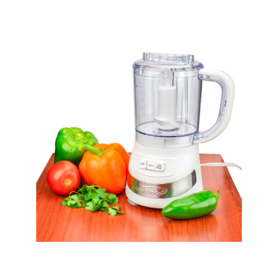 | Our 200w Brentwood FP-549W 3-Cup Food Processor saves you time and energy in the kitchen. It’s perfect for creating dips, salsas, chopping veggies, spices and more. Easy to use high/low 2 speed operation. Sharp, durable stainless steel blades mince foods in seconds. Safety lock lid prevents accidents. Compact design takes up little counterspace and is easy to store. BPA Free and dishwasher safe removable parts.  Features & Benefits • -2 Speeds + Pulse • -3 Cup Capacity • -Stainless Steel Blades • -Compact Design • -BPA Free • -Safety Lock Lid • -Dishwasher Safe Removable Parts • -Anti-Slip Suction Feet • -Cord Storage • -Color: White • -Power: 200w Product dimensions are 7"D x 5"W x 1  |
