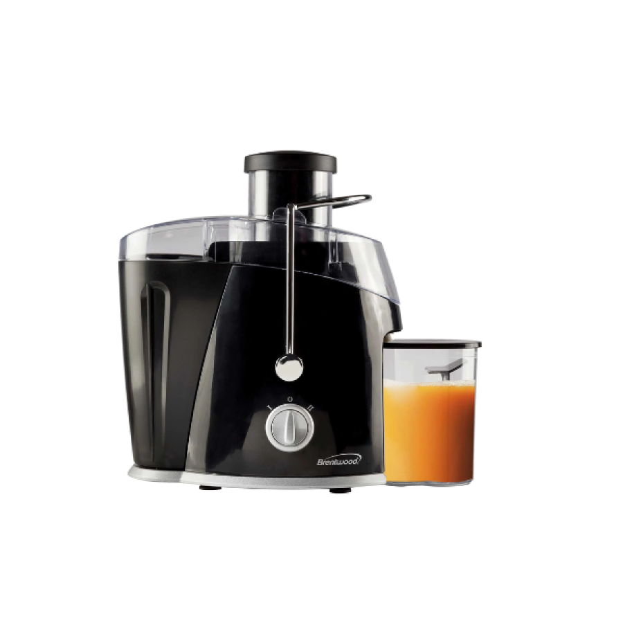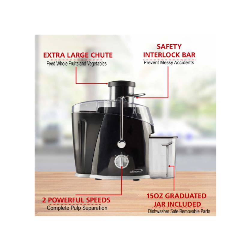 The Brentwood JC-452B 2-Speed 400W Juice Extractor features a powerful 400-watt motor and two speed settings, suitable for a variety of fruits and vegetables. It includes an extra-wide feeder chute to accommodate larger produce, reducing prep time, and comes with a 15-ounce (350 mL) capacity graduated jar that has a lid and foam separator. The juicer is made of a black plastic housing with durable stainless steel blades and has a safety interlock mechanism to prevent accidents.