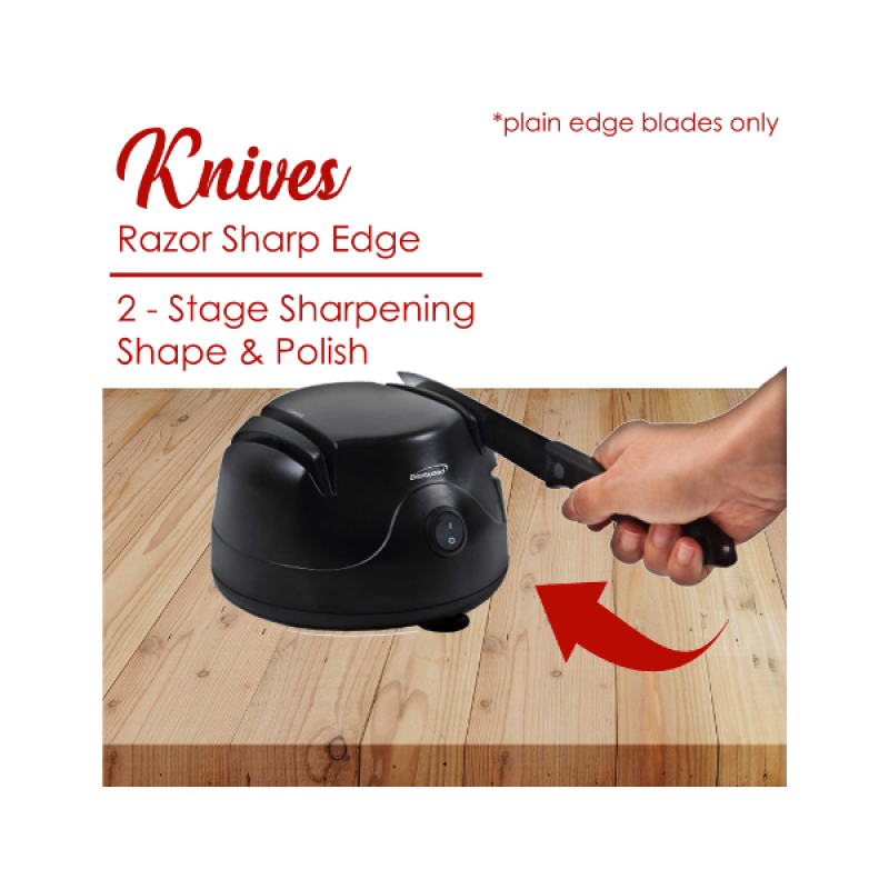 Use the Brentwood TS-1002 Knife and Tool Sharpener to easily put a razor sharp edge on kitchen and sports knives using the professional 2 stage sharpening system. Stage one reshapes the edge while stage two polishes it. No skill necessary with precision blade guides. You can also sharpen scissors and flat head screwdrivers. Safe anti-slip feet keep the sharpener secure in place. The power cord automatically retracts into the base with the push of a button.