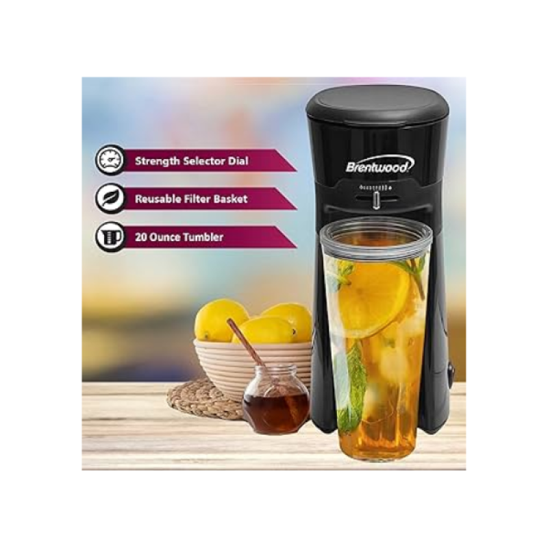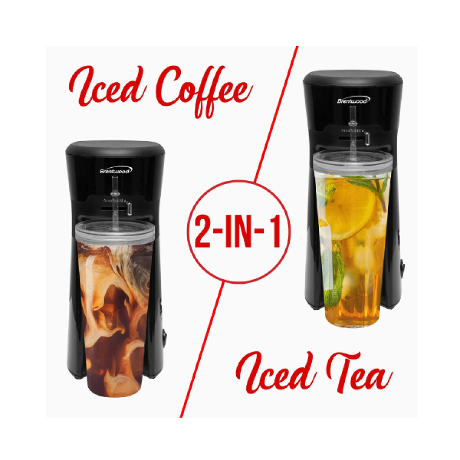 Use the Brentwood KT-2121BK Single Serve Iced Coffee and Tea Maker with 20oz Insulated Tumbler and Reusable Filter to make single servings of your favorite brews. Enjoy light to dark and bold brews using the strength selector dial. A reusable filter basket is an eco friendly way to reduce waste. The unit features auto shut off once the brew cycle has completed.