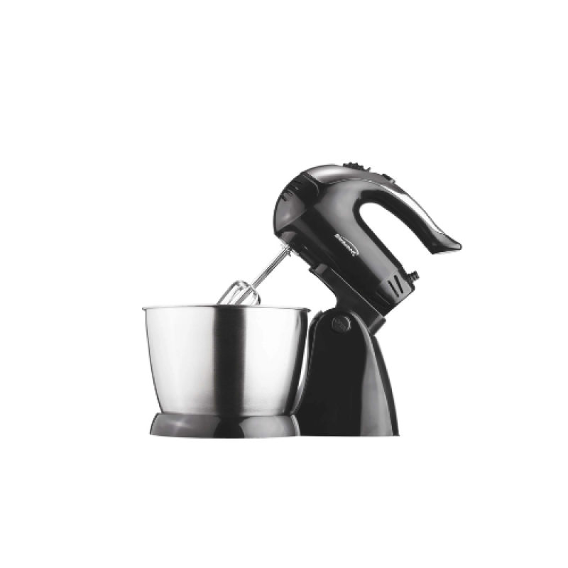 | The powerful 200 watt Brentwood Hand & Stand Mixer works wonderful to easily beat eggs, whip cream, mix batter and more.  Enjoy one hand operation. 5 speeds plus turbo handle mixing tasks from thick to thin. Converts into a hand mixer with the push of a button. Ergonomic handle makes for effortless mixing. Includes dishwasher safe chrome plated whisk beaters, dough beaters and one large 3 quart stainless steel bowl. Tilt the mixer back to easily place and remove beaters and bowl. Anti-slip feet keep the stand mixer secure in place. Features & Benefits • - 5 Speeds + Turbo • - One Hand Operation • - Converts to Hand Mixer • - Includes Whisk/Dough beaters & 3 qt Mixing Bowl • - Dishwasher Safe Beaters and Bowl • - Anti-Slip Feet • - Stainless Steel Mixing Bowl • - Lightweight Compact Design • - Colour: Black  |