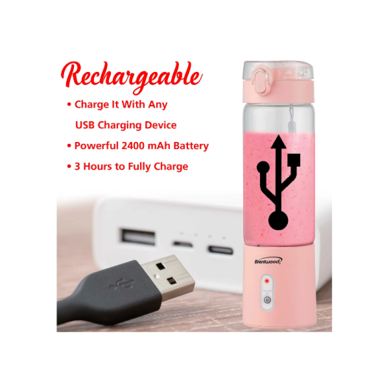 The Brentwood 17-oz. Portable Battery-Operated USB Glass Blender (RJB-100BK) in black is a compact, single-speed blender designed for making smoothies and shakes on the go. It features an 8-leaf stainless steel blade assembly and a glass jar with a sipping lid