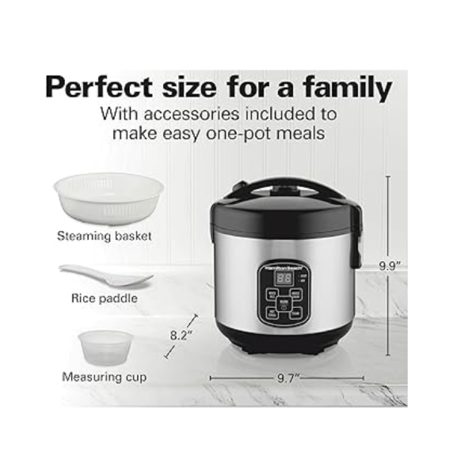 The Hamilton Beach 10-Cup Rice Cooker is specified as a corded electric appliance (120 volts) designed for ease of use, with a capacity that yields up to 20 cups of cooked rice from a maximum of 10 cups of uncooked rice. Key features include easy one-touch automatic cooking, which shifts to a warm setting when the food is ready, and a non-stick aluminum inner pot and plastic or glass lid that are often dishwasher safe. The cooker typically weighs around 5 pounds.