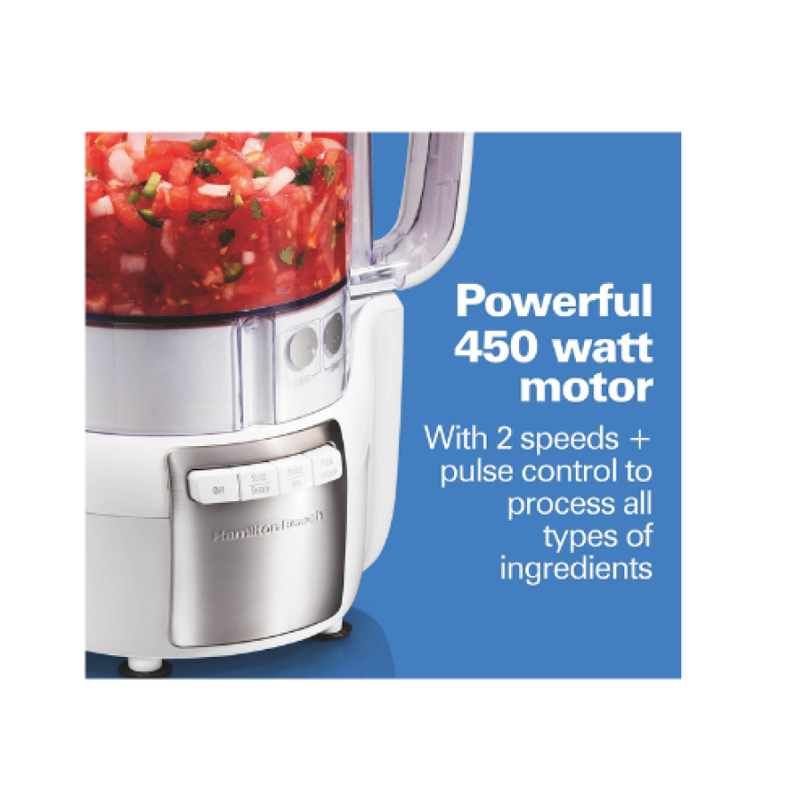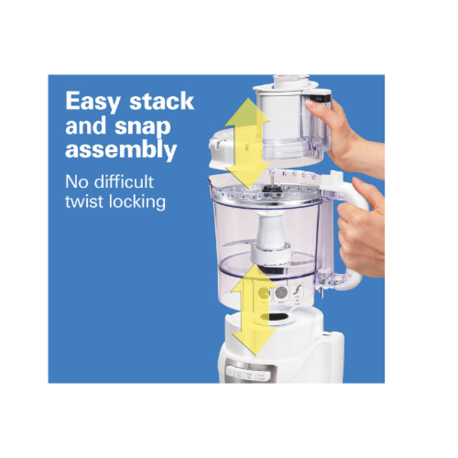 The Hamilton Beach Stack & Snap Food Processor takes the guesswork out of food processing with its easy stack and snap assembly and simple function guide that shows you which blade to use and which button to push. The versatile stainless steel S-blade chops, mixes and purees, and the reversible disc lets you slice or shred. For effortless cleanup, the bowl, blades and lid are dishwasher safe.