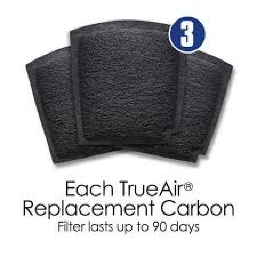 The Hamilton Beach TrueAir replacement Carbon Filter (3 pack) features activated carbon material designed to last up to 90 days per filter, The filters are specifically designed to trap and neutralize common household odors from pets, cooking, and smoke in compatible TrueAir models like the 04384 and 04532GM. They offer easy, tool-free installation and should not be rinsed with water to maintain effectiveness.