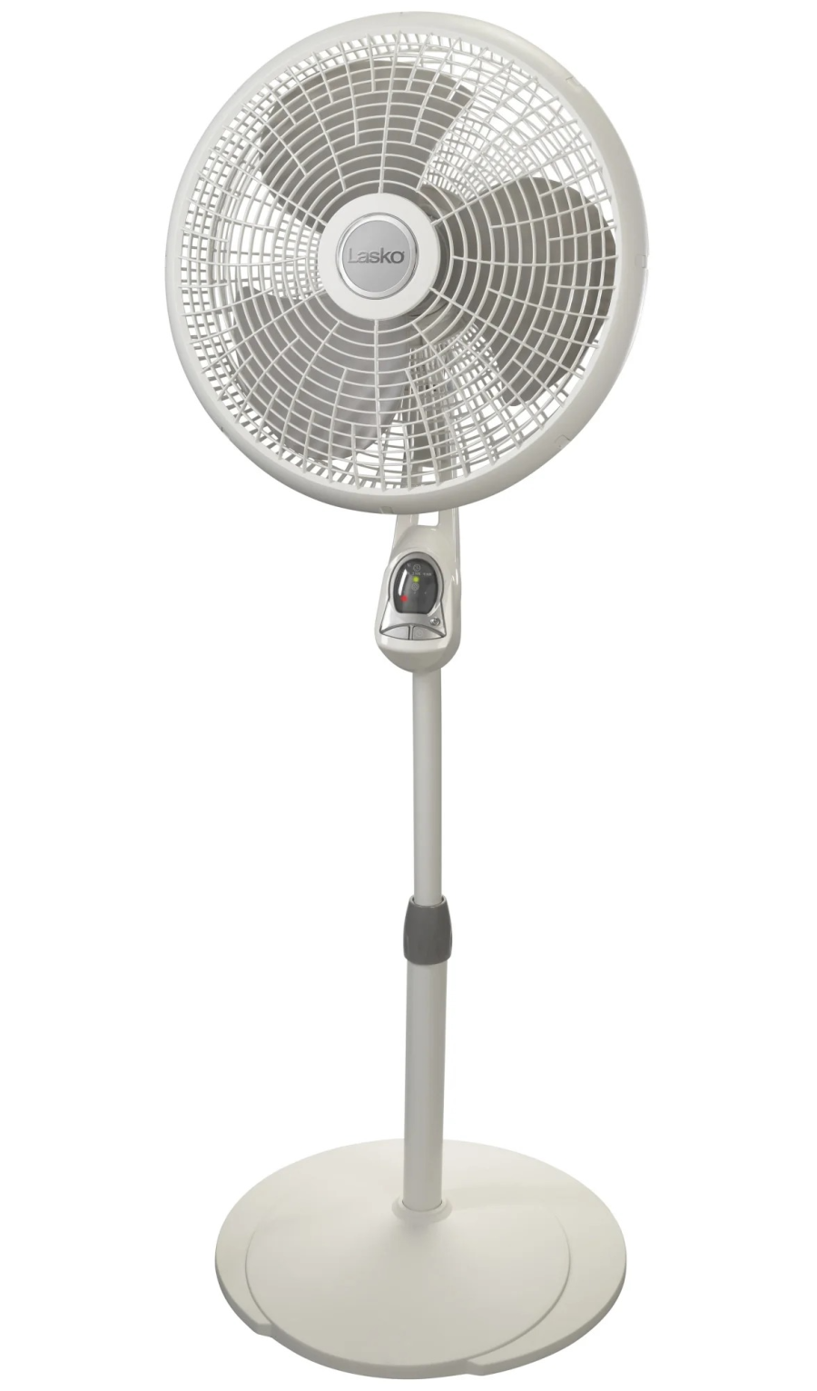 The Lasko 16-inch oscillating pedestal fan features a 16-inch blade diameter and delivers up to 1140 CFM of airflow, powered by a 120 V electrical connection. The fan offers three quiet, energy-efficient speeds, widespread oscillation, and a tilt-back fan head to direct airflow, all controllable via either manual or electronic controls depending on the specific model. Its height is fully adjustable, typically ranging from 34 to 47 inches, providing versatile cooling options for various room sizes. It is designed for simple, no-tools assembly and includes Lasko's patented safety fuse technology, known as the "Blue Plug", for added peace of mind.