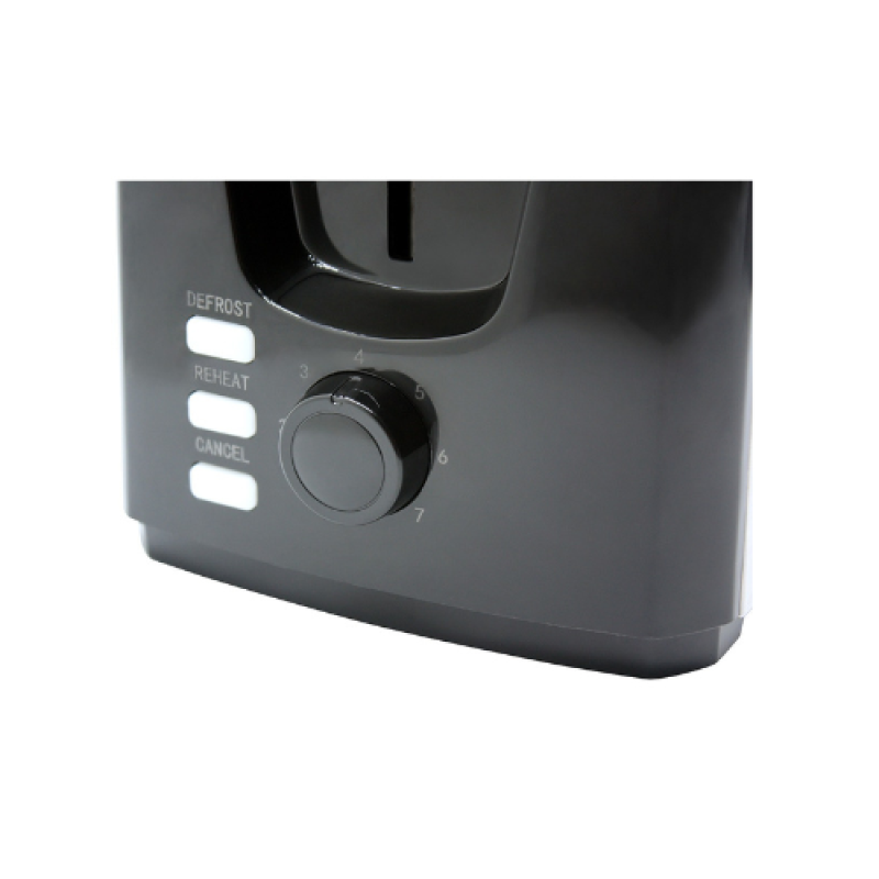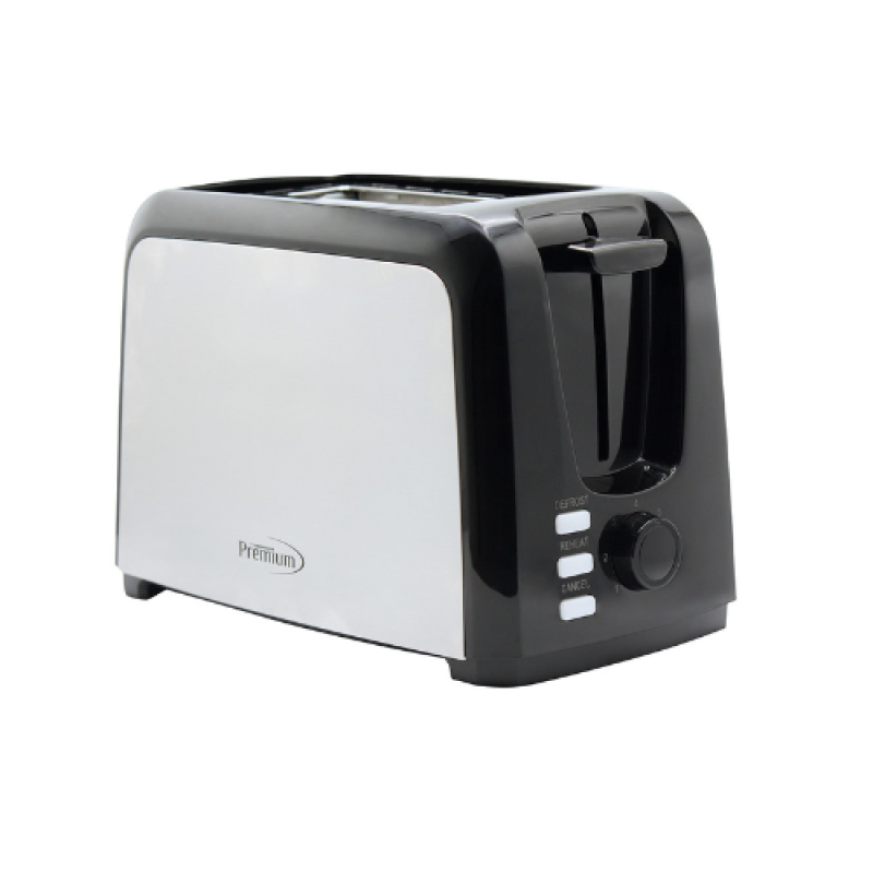 The Premium Levella PT22055 is a 2-slice toaster. It has a 7-shade setting knob, and features reheat, defrost, and cancel functions. It also includes a removable crumb tray, stainless steel sides, cord storage, and a red indicator light.