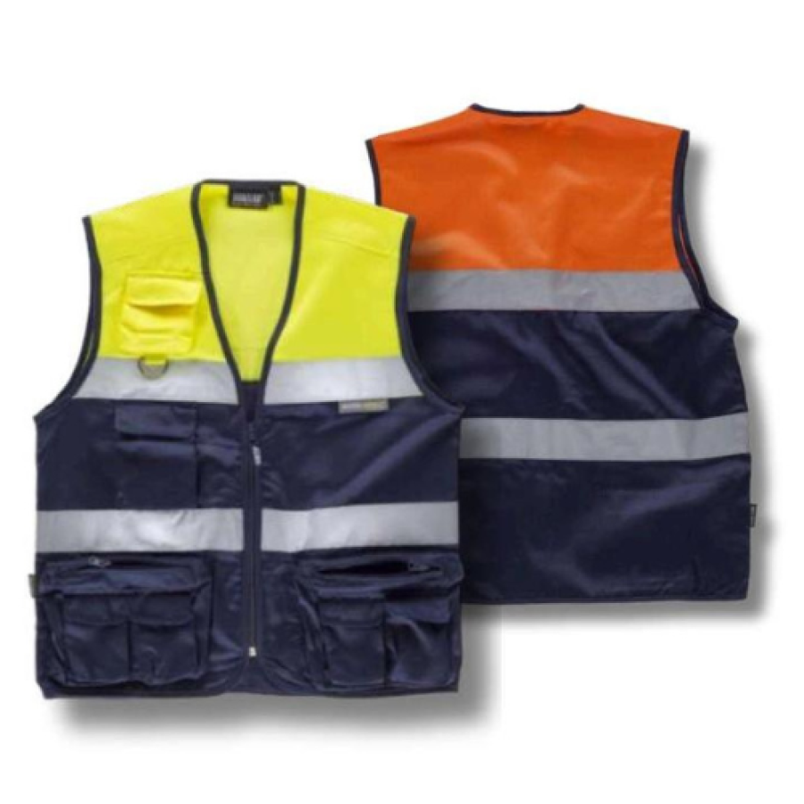 The Vest C4010 Navy/Yellow Size XL is a multi-pocket, high-visibility work vest made from durable polyester fabric, designed for functionality and visibility in various work environments